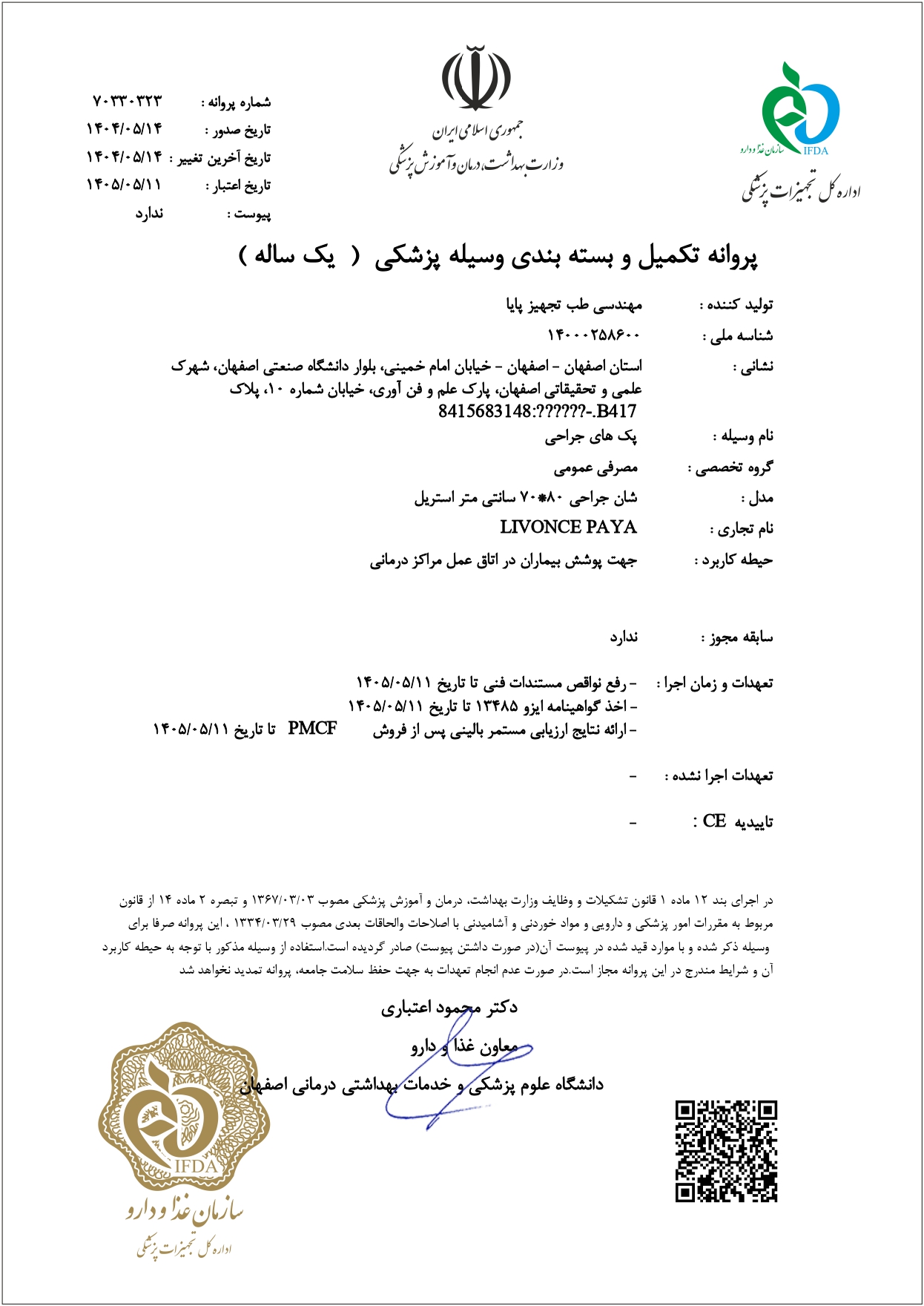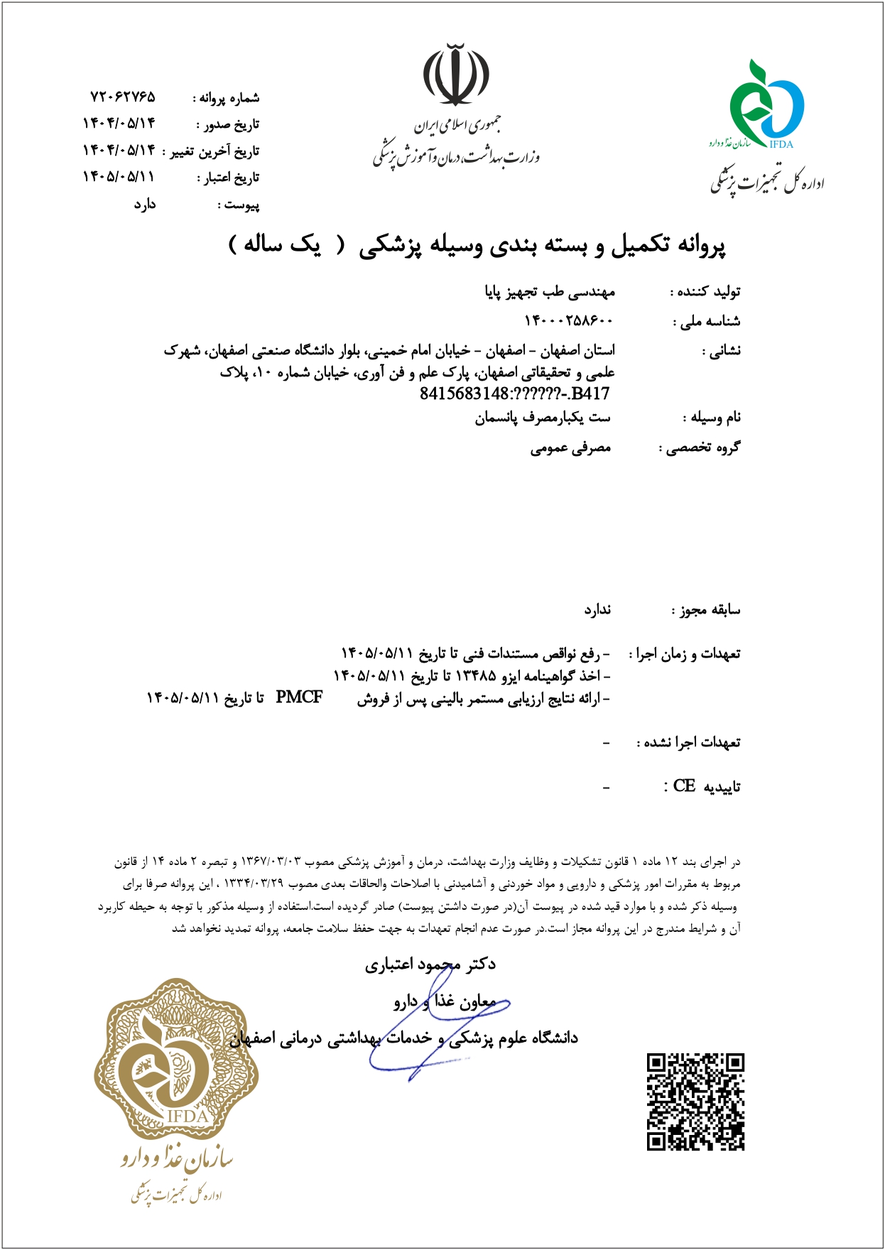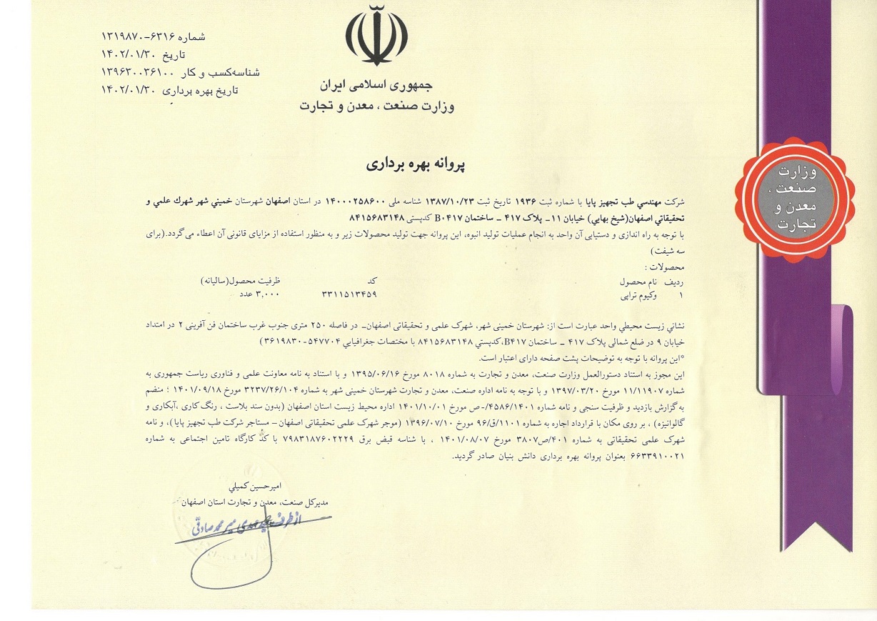 شرکت مهندسی طب تجهیز پایا، موفق به اخذ تاییدیه های لازم از وزرات بهداشت و اداره کل تجهیزات پزشکی و مجوز تکنولوژی برتر (صنایع هایتک) از وزارت صنایع و معادن گردیده و به صورت کاربردی در بزرگترین مراکز درمانی استان اصفهان که تحت نظارت معاونت درمان این استان و مراکز درمانی سراسر کشور بوده اند استفاده گردیده است.