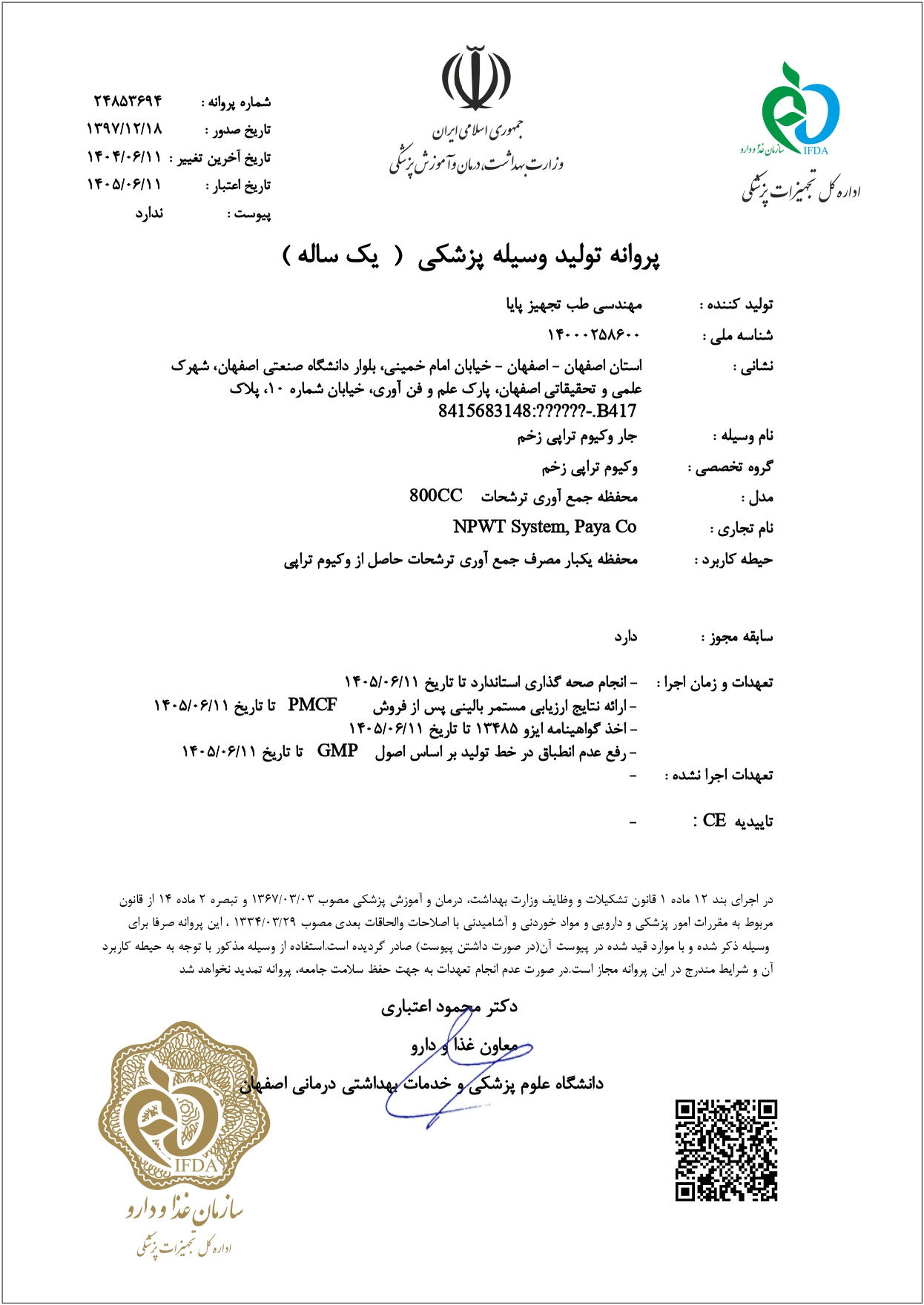 شرکت مهندسی طب تجهیز پایا، به عنوان اولین تولید کننده سیستم کامل وکیوم تراپی زخم (NPWT) در ایران، گواهی حسن انجام کار از معاونت درمان استان اصفهان و مراکز درمانی-آموزشی شهرهای مختلف برای کارکرد طی این سال ها دریافت نموده است.